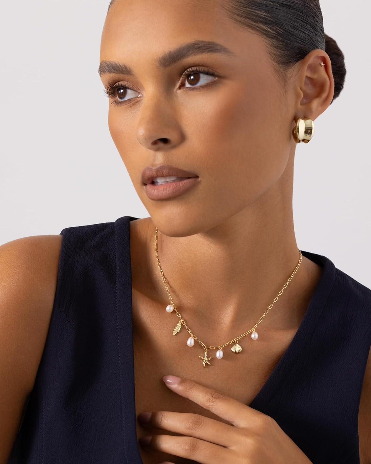 PAVOI 14K Gold Plated Beach Charm Necklace for Women - Dainty Paperclip Chain Trendy Beachy Multi Charm Necklace - Gold Ocean Summer Jewelry with Freshwater Pearl, Sea Shell, Starfish(Yellow Gold)