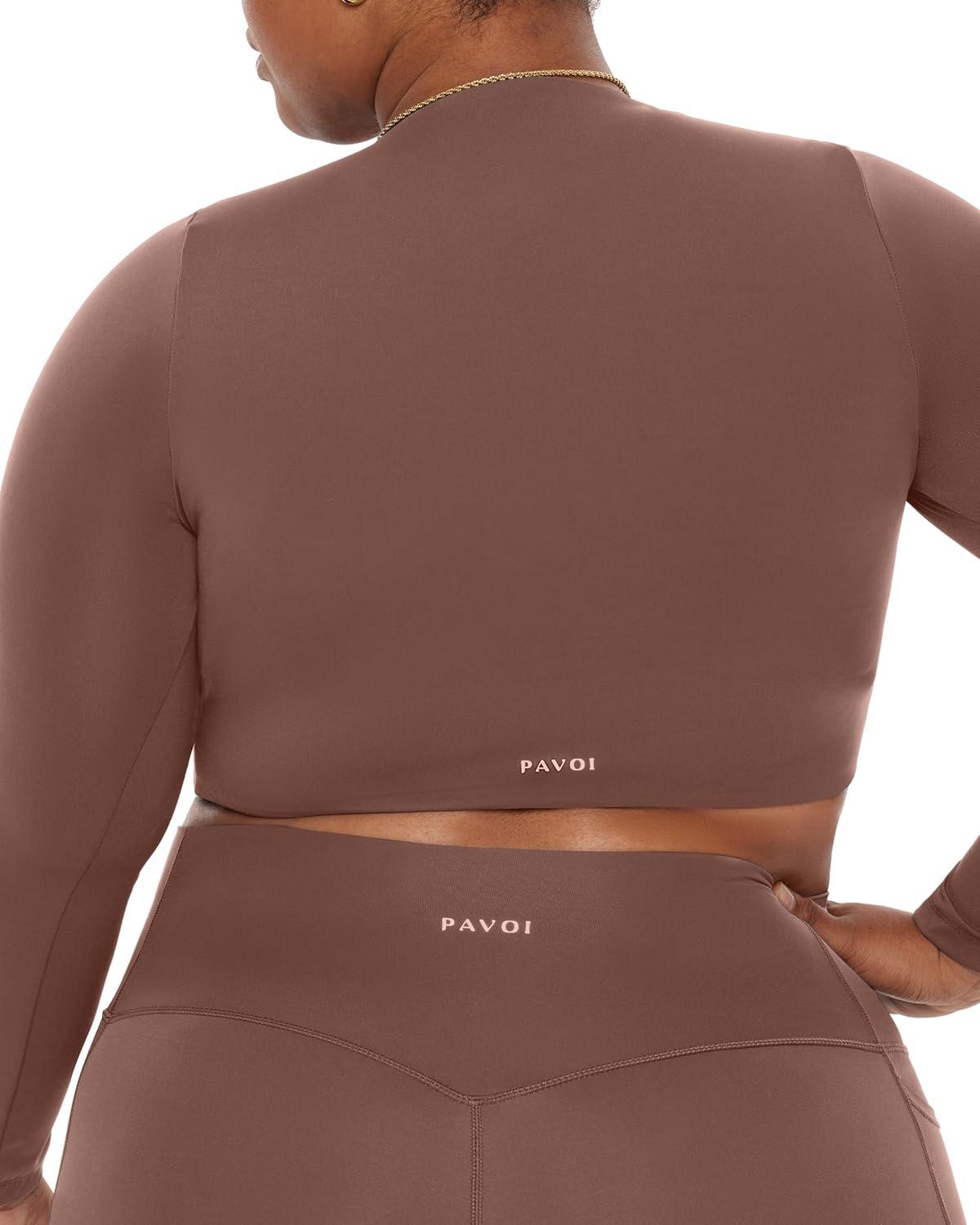PAVOI ACTIVE Long Sleeve Crop Top | Medium Support Crew Neck Moisture-Wicking Women’s Performance Gym Workout Tee | HiPerform(Clay)