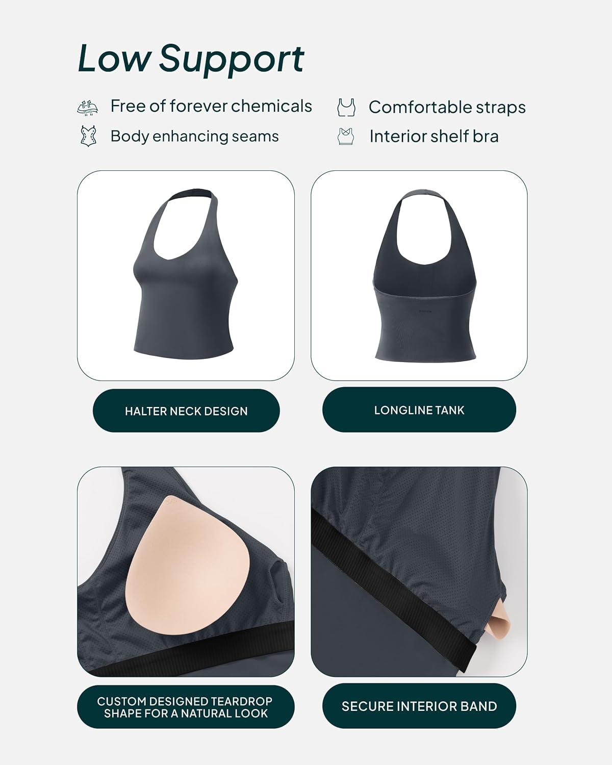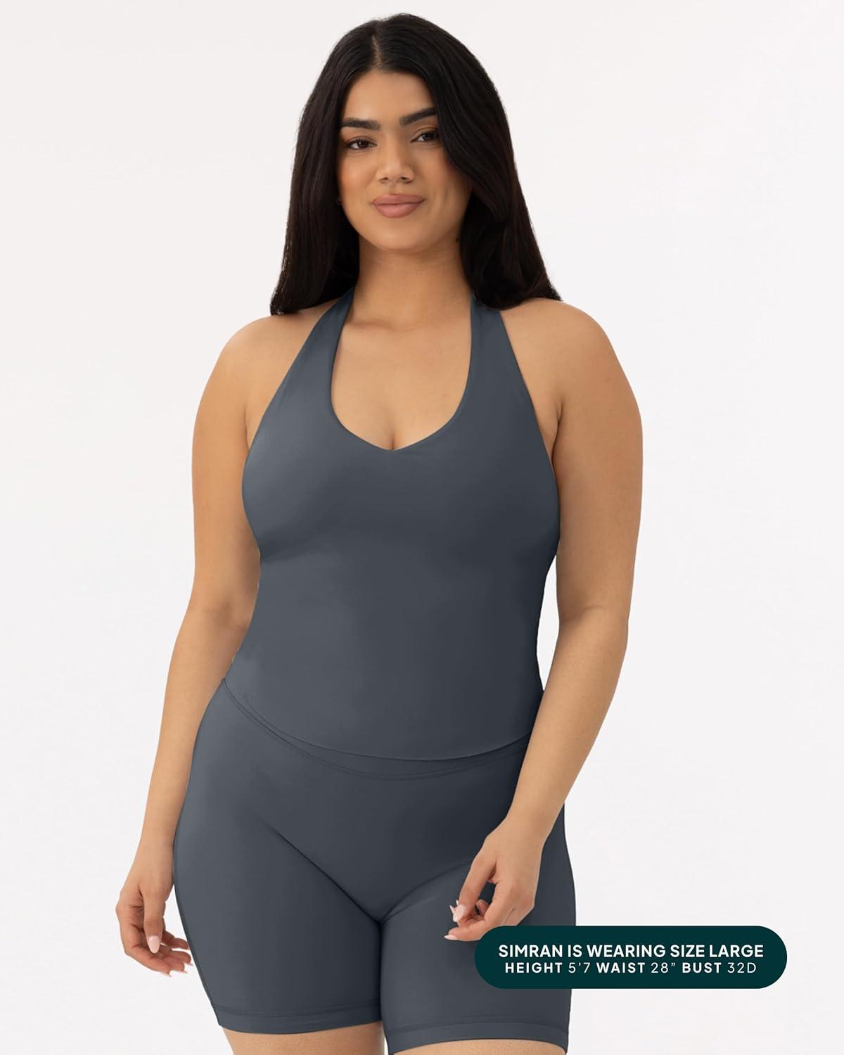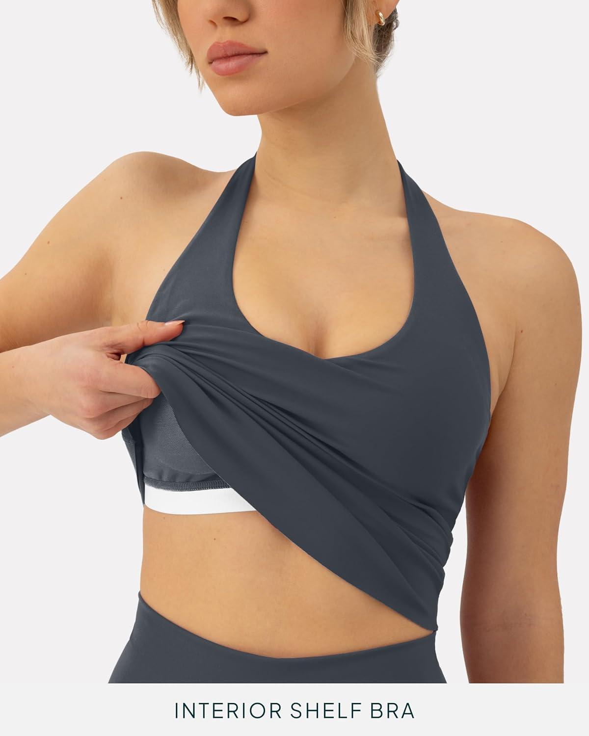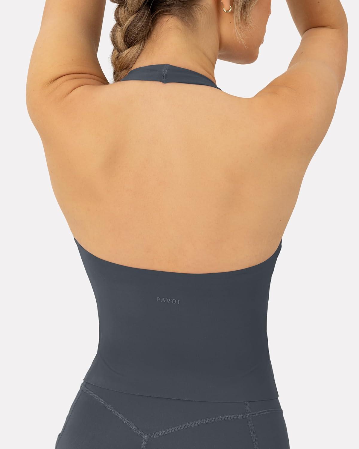 PAVOI ACTIVE Workout Halter Tops for Women Built in Bra – Low Support V Neck Backless Sports Tank Top Shelf Bra – HiPerform(Thunder)